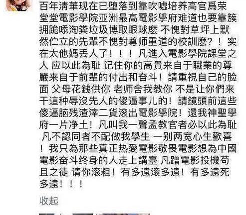 他愤怒不堪:“堂堂电影学院亚洲最高电影学府也要靠簇拥跪舔掏粪垃圾博取眼球吗?不愧对草坪上默然伫立的先辈不愧对尊师重道的校训吗?实在太他妈的丢人了!!!”