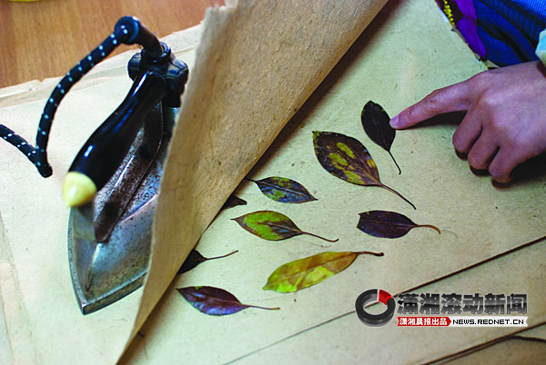 (②压平香樟叶,把叶子平放在两张牛黄纸之间,用电熨斗熨烫,3分钟左右即可。图/潇湘晨报记者辜鹏博)