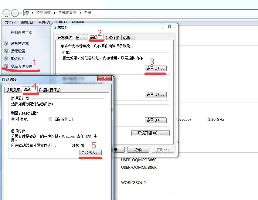 2. 点击【高级系统设置】→【高级】→性能【设置(S)】→【高级】→虚拟内存【更改(C)】: