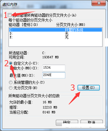 3. 取消勾选【自动管理所有驱动器的分页文件大小】→点击【自定义大小(C)】→【设置】: