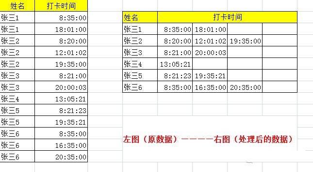 在前几期的内容中有个粉丝问我,他们的考勤表由纵列的转化为横向的,如下图,请问这个是怎么实现的呢?