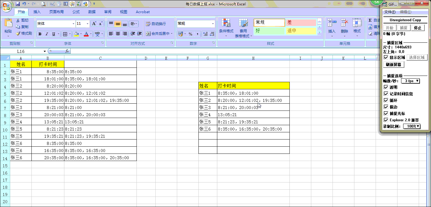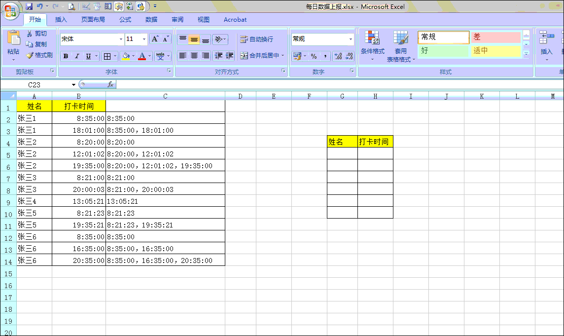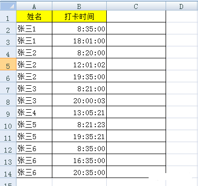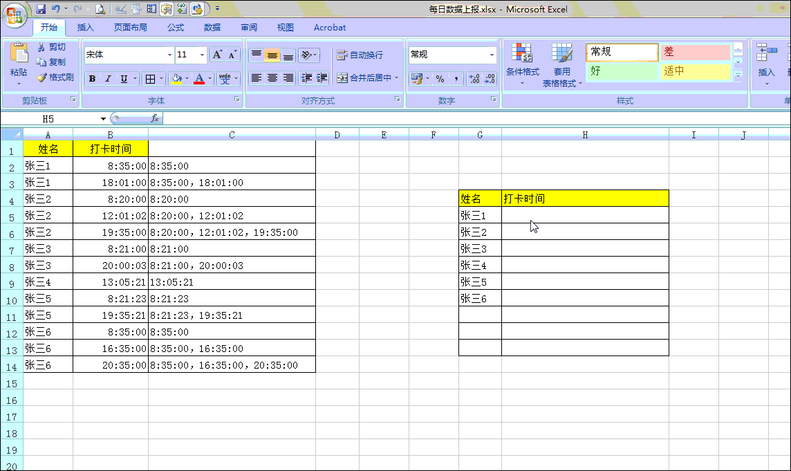 首先在g4和e4中分别输入【姓名】和【打卡时间字段】,如下图所示,然后在g5单元格中输入以下公式: