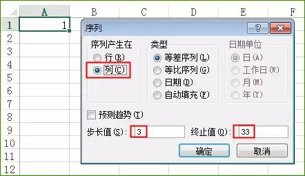 实验:打开你的EXCEL,在A1单元格输入1,然后执行“开始——编辑——填充——序列”,弹出“序列”对话框,按照截图所示进行设置。