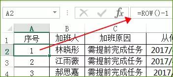 这是小编要推荐的方式,因为我们工作中,可能更多的场景是这样的。A列的序号,可能实际操作中会经常增删。比如说,将“曾云儿”对应的序号5,这一行删除。随之出现的问题是:序号中断了,5删除了,只留下4、6。又如果,需要增加加班人新增序号,又如何办呢?