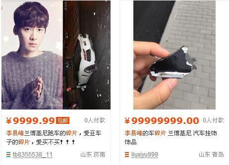 事故发生后,现场没被清理干净,商家打起了车辆碎片的主意,把碎片捡来后放到某宝上售卖,“李易峰车祸碎片”“李易峰兰博基尼”成为商品搜索关键字,而商品出来后也是惊呆了小编,碎片价格有1元、500元、999元、9999元、150000元,甚至还有8个9的价格出现(目测价格为假),区区一点碎片的价格竟然相差这么多倍!