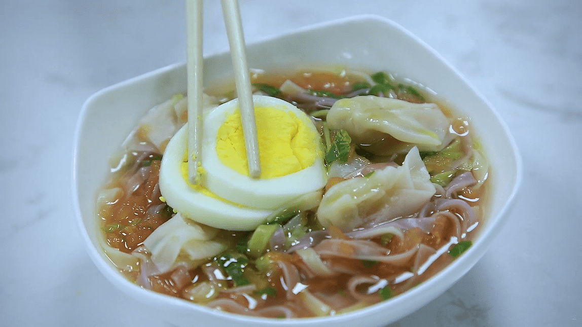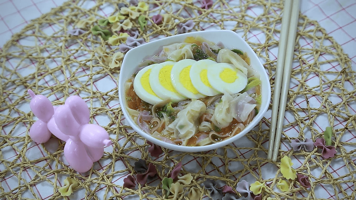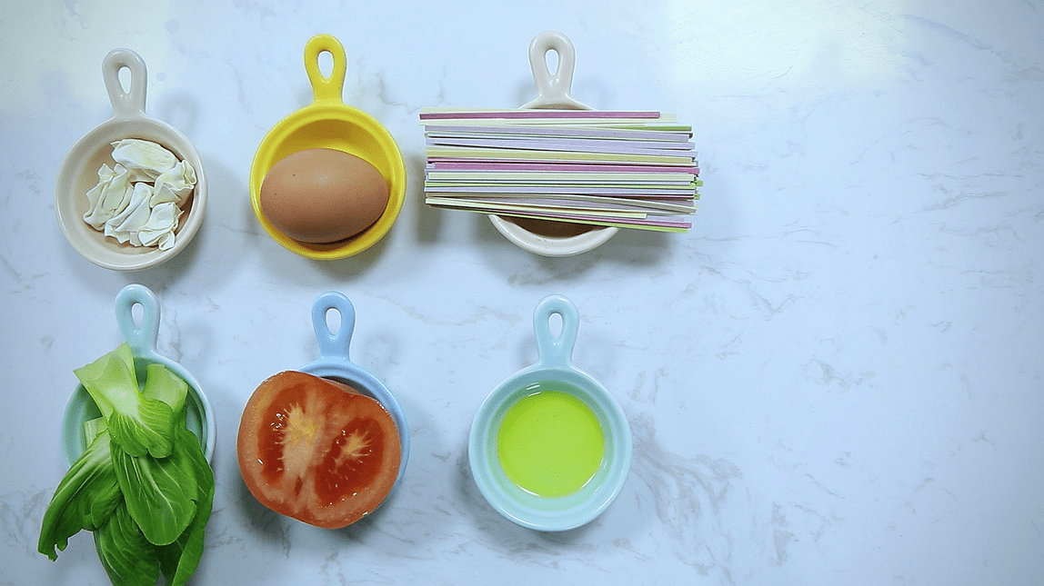 食材:煮熟的鸡蛋1个,西红柿半个,油菜1颗,香菇鸡肉小馄饨5个,综合长面适量,紫苏子油适量。