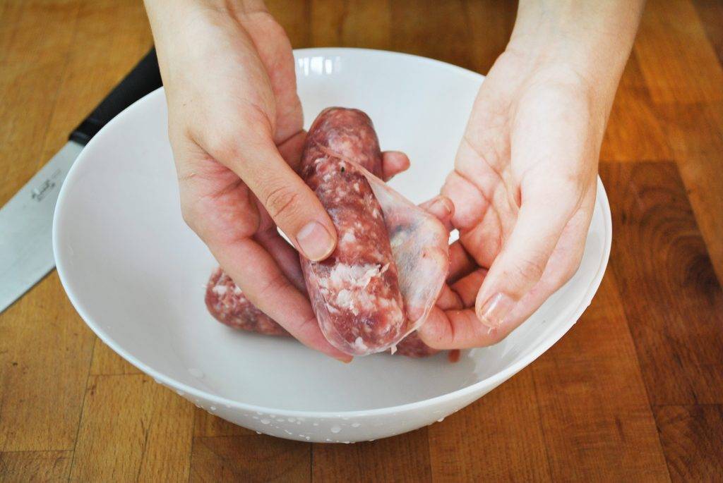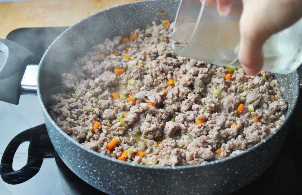 在锅里撒上细雨的油把药草炒熟,然后加入香肠使其呈褐色。倒入葡萄酒并混合。