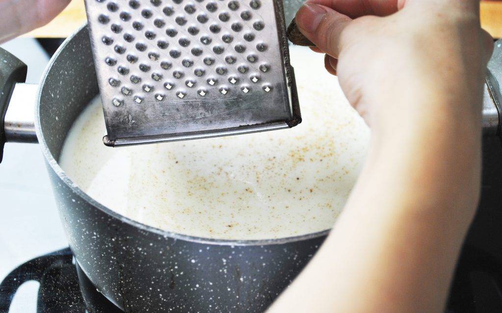 用牛奶稀释,加盐和胡椒粉煮至变稠。最后,加入少许肉豆蔻的香水。