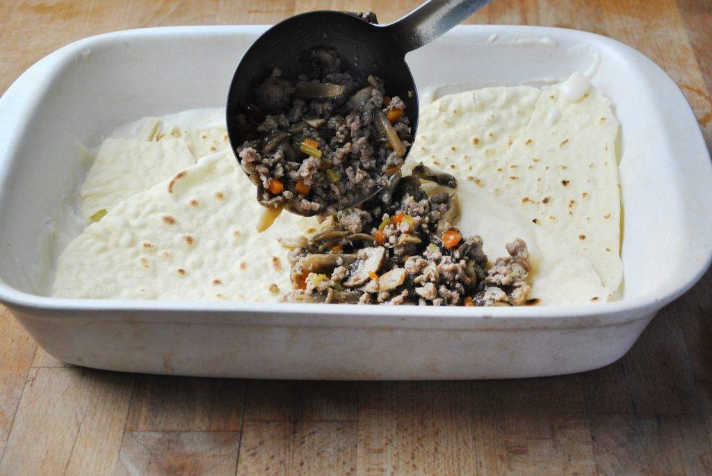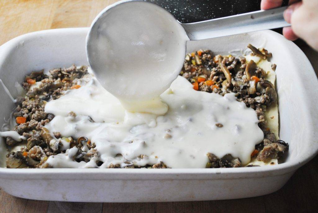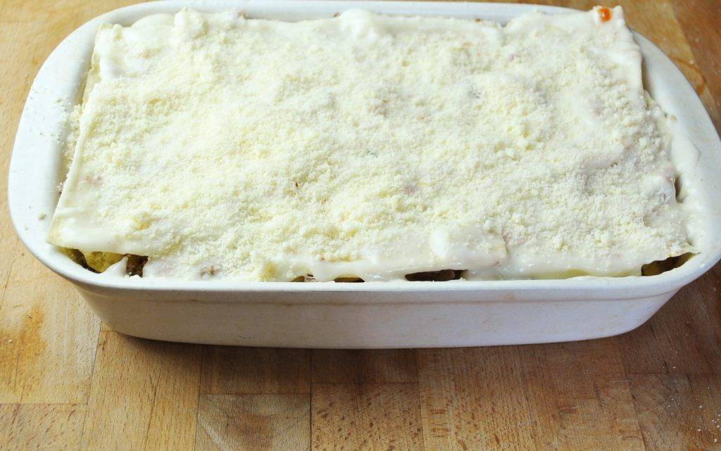 继续进行分层,直到所有成分都用完,然后加入贝沙梅尔和磨碎的帕玛森芝士。在160摄氏度下烘烤,然后煮约一个小时。