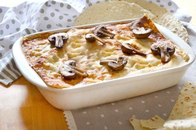 从烤箱中取出千层面面包的千层面,将其切成薄片,然后将其分配在盘子上。配以半蘑菇烤,然后趁热食用。