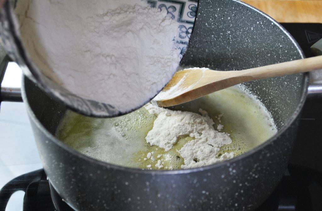 同时,准备调味酱;将黄油在锅中融化,加入面粉,然后将所有物质完全融化。