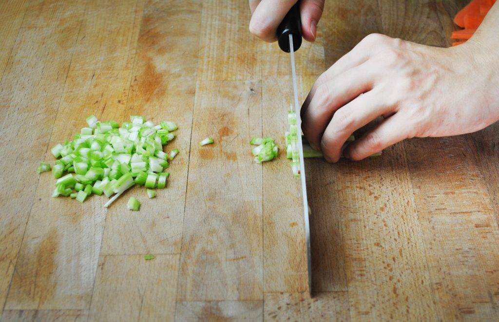 清洁芹菜,用刀细切;用胡萝卜和葱做同样的事情。