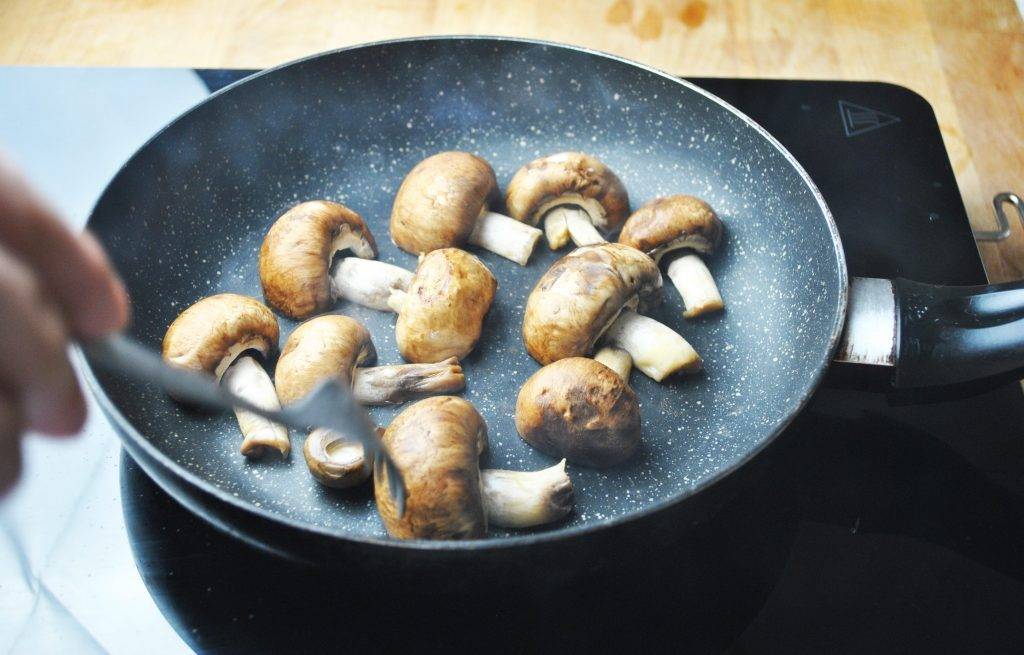 将蘑菇切成两半,放在热不粘锅中烧烤;煮熟后,用少许盐和胡椒粉和细雨油调味。