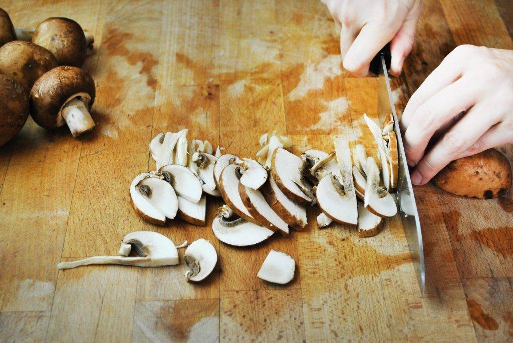 将蘑菇去皮,切成薄片,将整个蘑菇放在一边。