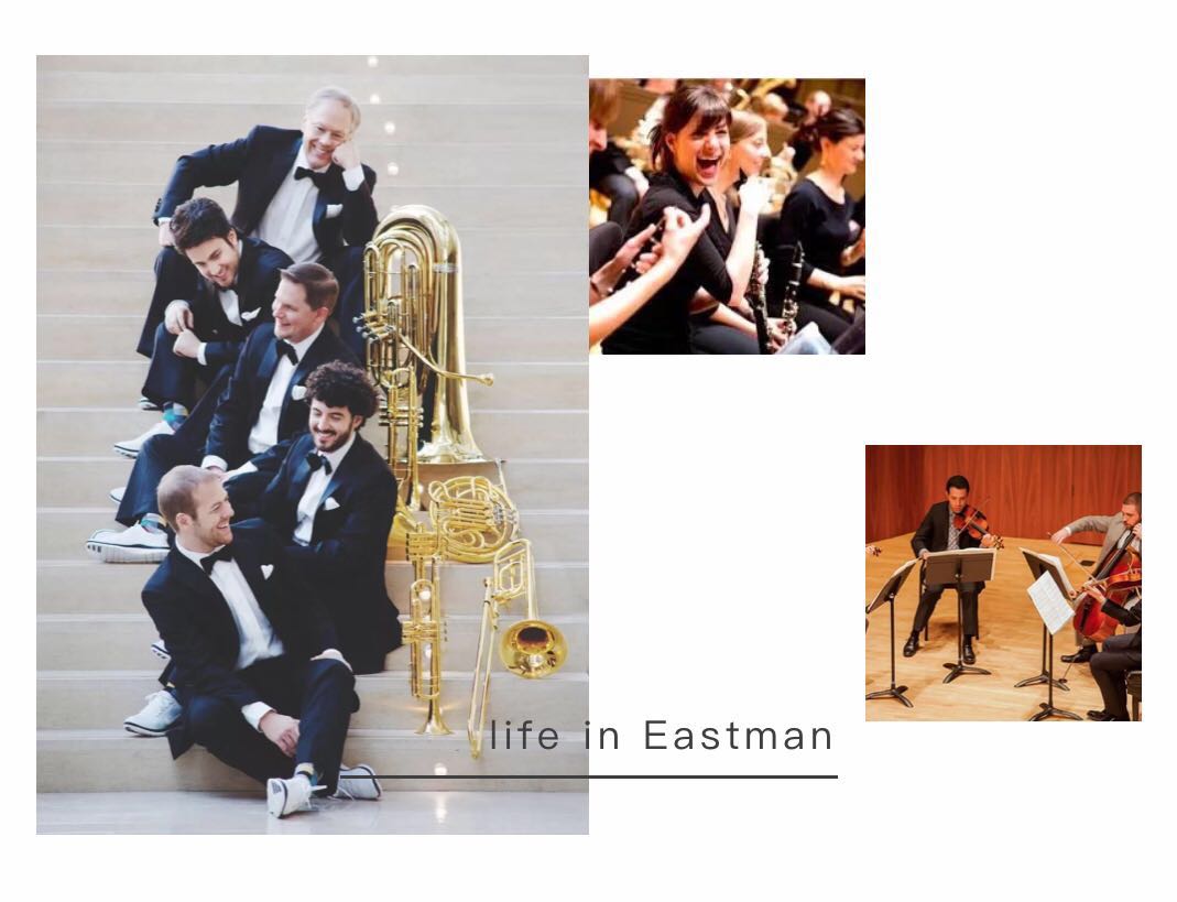 伊斯曼音乐学院本科开设应用音乐(表演)、作曲、爵士研究&当代媒体、音乐教育、音乐理论等主修专业,研究生增加指挥(合唱、管弦乐、管乐器)、影视作曲、音乐早教、歌剧、钢琴伴奏&室内音乐。