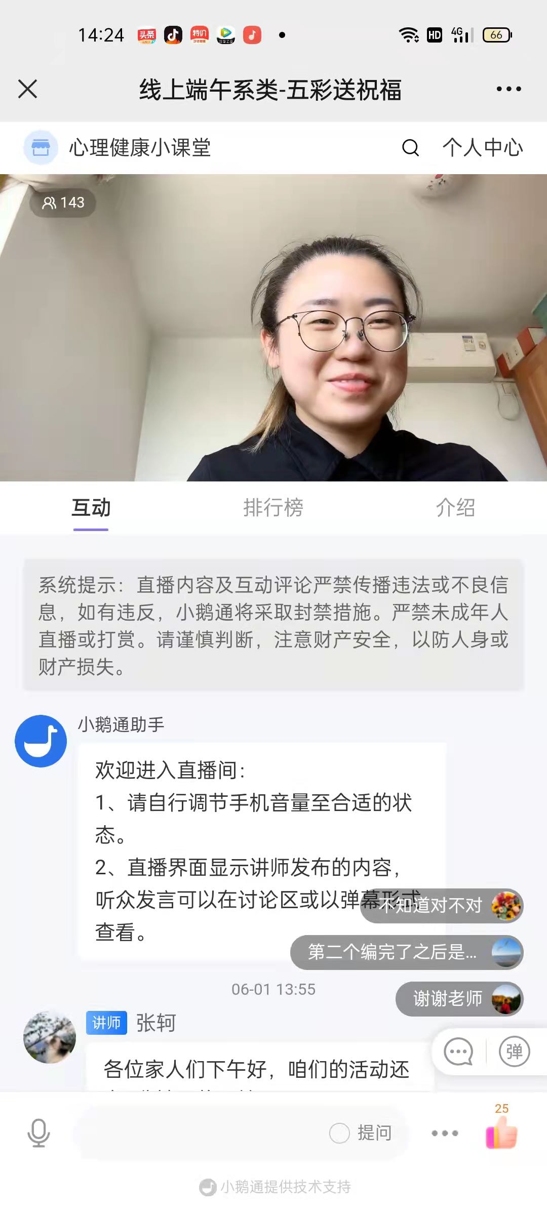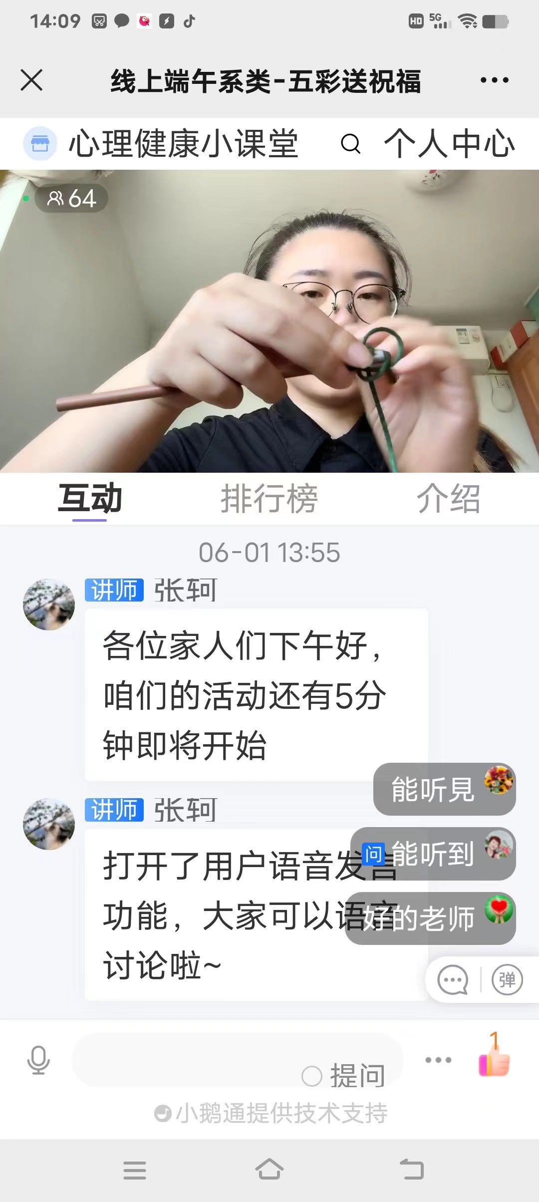 手工艺人杨荣佳老师,教授大家编制端午祝福五彩绳手艺,通过元平台互动,温馨家园的家人们积极互动,纷纷把制作的五彩绳发给老师看,得到了老师的夸赞。
