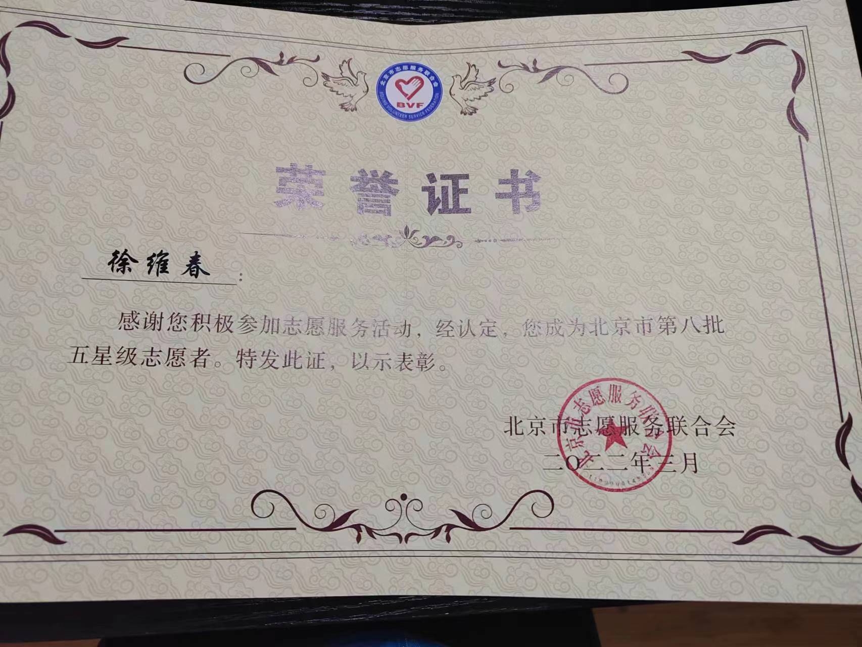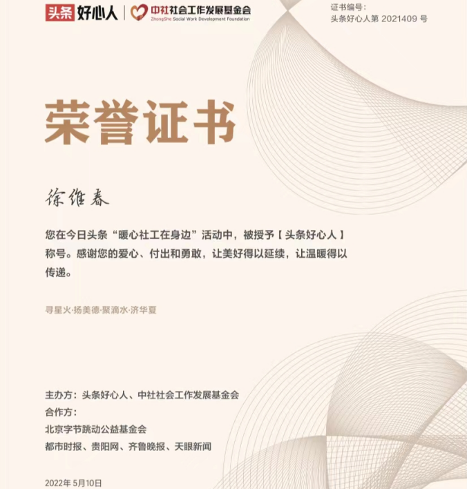 “头条好心人”是由头条好心人、中社社会工作发展基金会、北京字节跳动公益基金会、都市时报、贵阳网、齐鲁晚报、天眼新闻努力寻找、评选出来的。徐维春从全国成千上万好心人中脱颖而出,她的事迹感动人、鼓舞人、激励人做好心人,成为北京市通州区唯一获得“头条好心人”荣誉的人。徐维春在“志愿北京”平台参与志愿者活动记录工时达1500小时以上,被北京市志愿服务联合会授予“五星级志愿者”称号。