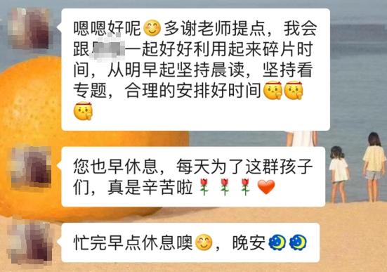 有人说晚上睡那么晚,为什么不在前一天晚上发掉呢?她说,如果老师都不能早起发晨读内容,学生又怎会有动力去做呢?这样岂不是失去了晨读的时效性和意义?