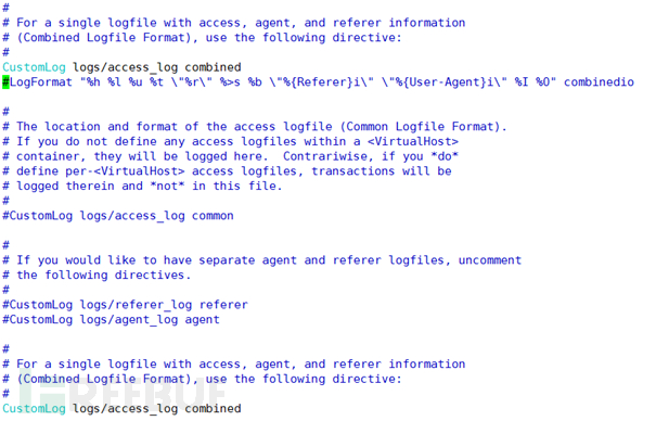 综合日志格式(combined log format),combined 结合以上三种日志信息。通常使用一个综合日志格式文件进行记录,配置为:CustomLog /var/log/apache2/ access.log combined