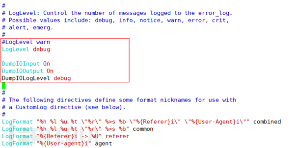把默认的LogLevel改成 debug,然后打开 DumpIO的请求和响应报文开关。这样,在logs/error_log下面就可以查看到所有的报文data部分。