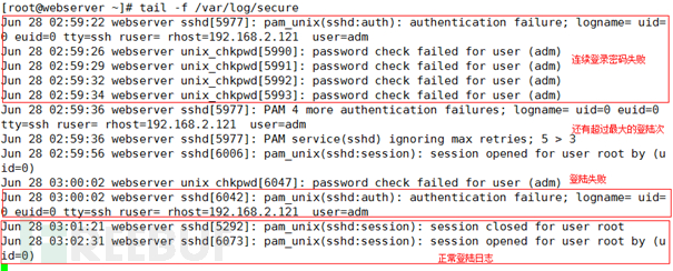 通过上述日志可以知道通过/var/log/secure可以检测异常登陆的用户,IP地址、用户名等信息,默认情况下ssh具有登陆次数,超过后断开连接。