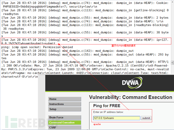 命令执行因为是通过web请求发生,因此操作系统命令无法记录web请求日志,智能通过access_log和error_log的dumpio模块检测请求的参数,已发现是否存在异常。