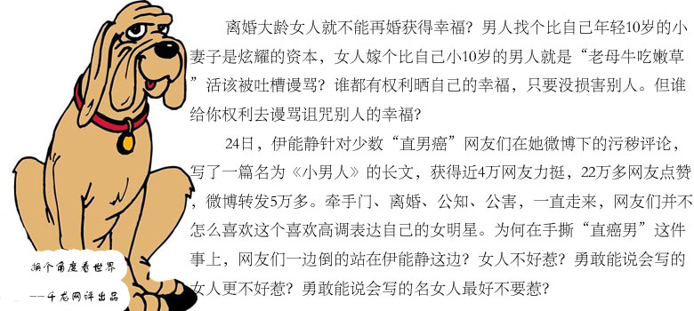 看评论,《小男人》不仅获得了女网友的力挺和支持,很多男网友也点赞、黑转粉。伊能静畅快淋漓的文字不仅让女性产生精神上的共鸣,也获得了更多男性的认同。“没有女人的产道就不会有你,没有女人的脐带供给你养分,你无法存活,没有女人的子宫,你不会被保护,你曾经在女人的身体里缩成一团,是女人的爱與勇敢才让你看见产道外的第一道光,是女人怀胎十月的期盼与勇气,你現在才有机会上网嘲笑女人老去。”其中最有力的支持者无疑是小她10岁的丈夫秦昊。秦昊在微博上向妻子表白,“两个人能不能一起和年龄没关系。我不在乎別人怎么看,我不是跟这个世界过,我是跟她过。”