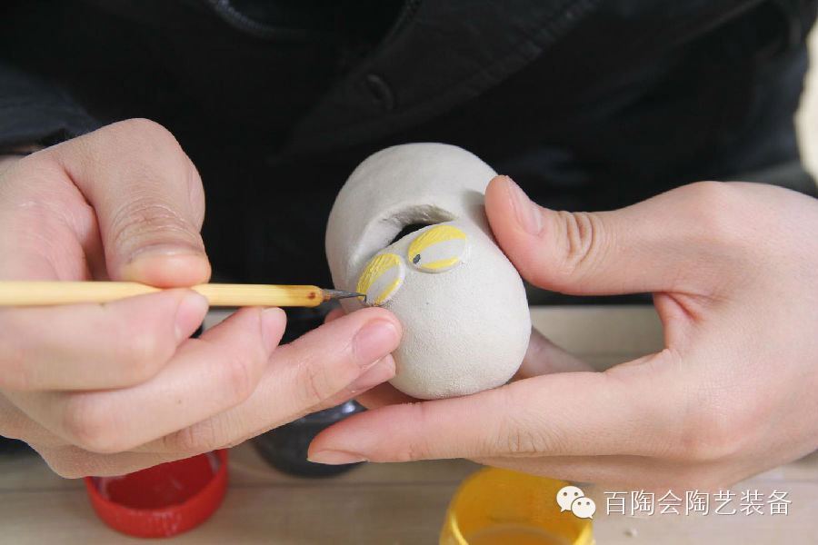 7、用釉料给小黄人的眼睛上色。