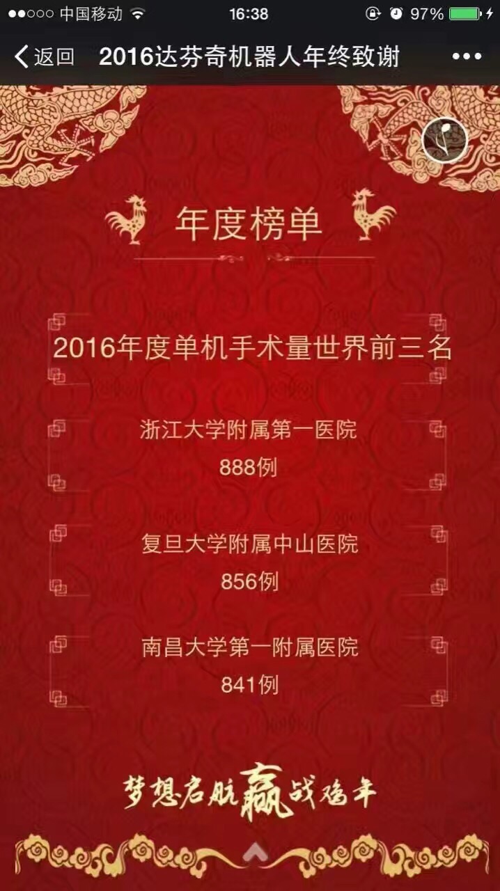 1.2015年,浙大一院机器人单机手术量达836台,居当时全球第一;2016年单机手术量达888台,蝉联全球第一。