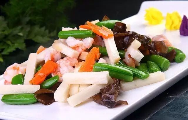 材料:胡萝卜、山药、蜜豆、木耳、白醋、玫瑰酒、淀粉、盐、鸡汁、糖、橄榄油、蚝油