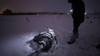从图片显示,飞机坠毁在白雪覆盖的田野间。塔斯社引述官员的话说,附近已经找到了一些遗体。