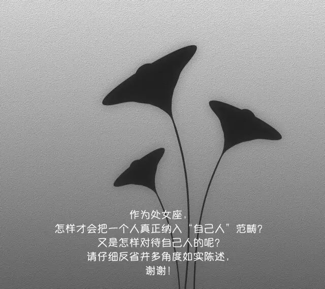 可能还有其他因素的影响,比如志同道合、臭味相投、赏心悦目、惺惺相惜、独立空间等等,不知道哪些加分项的累积可以成为处女座的自己人,哪些减分项又导致永远无缘自己人,一切都在处女座的心里。