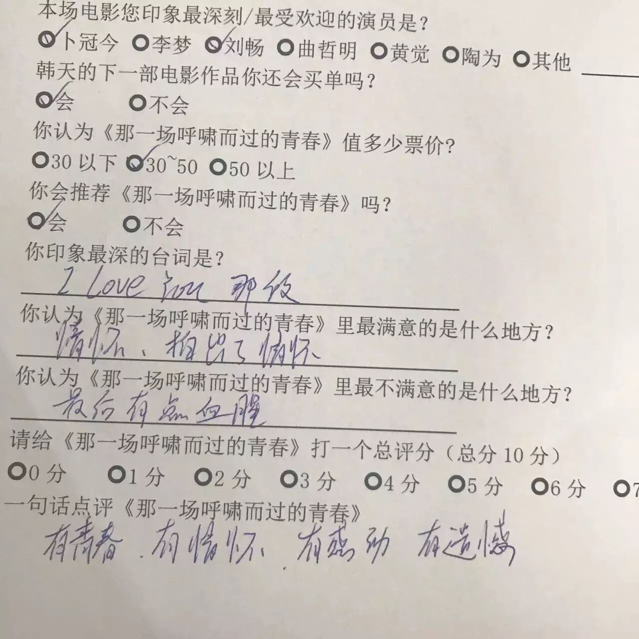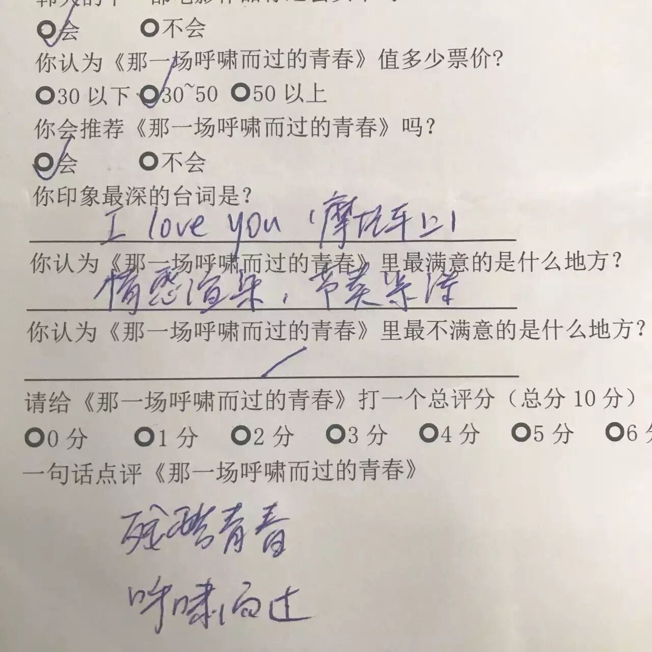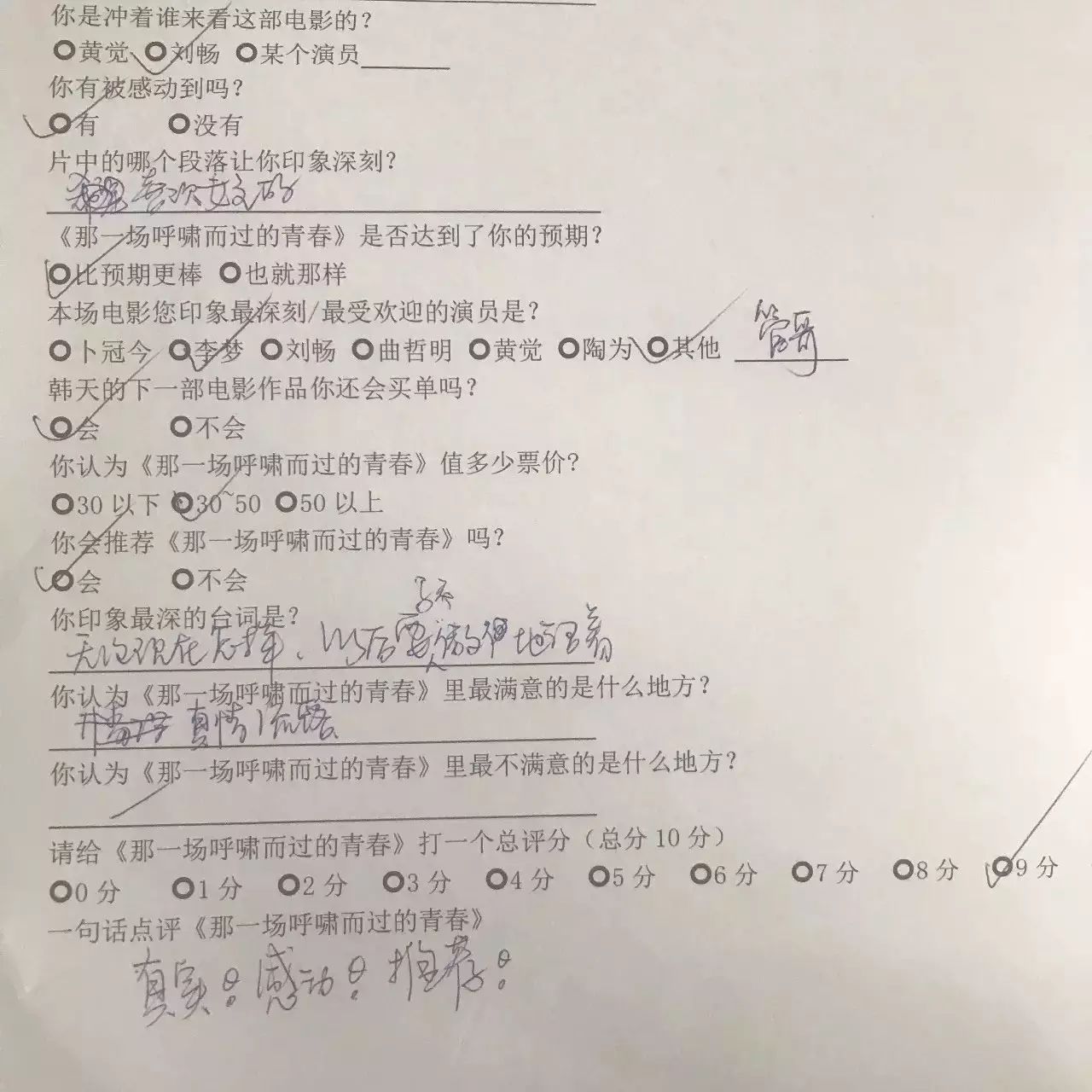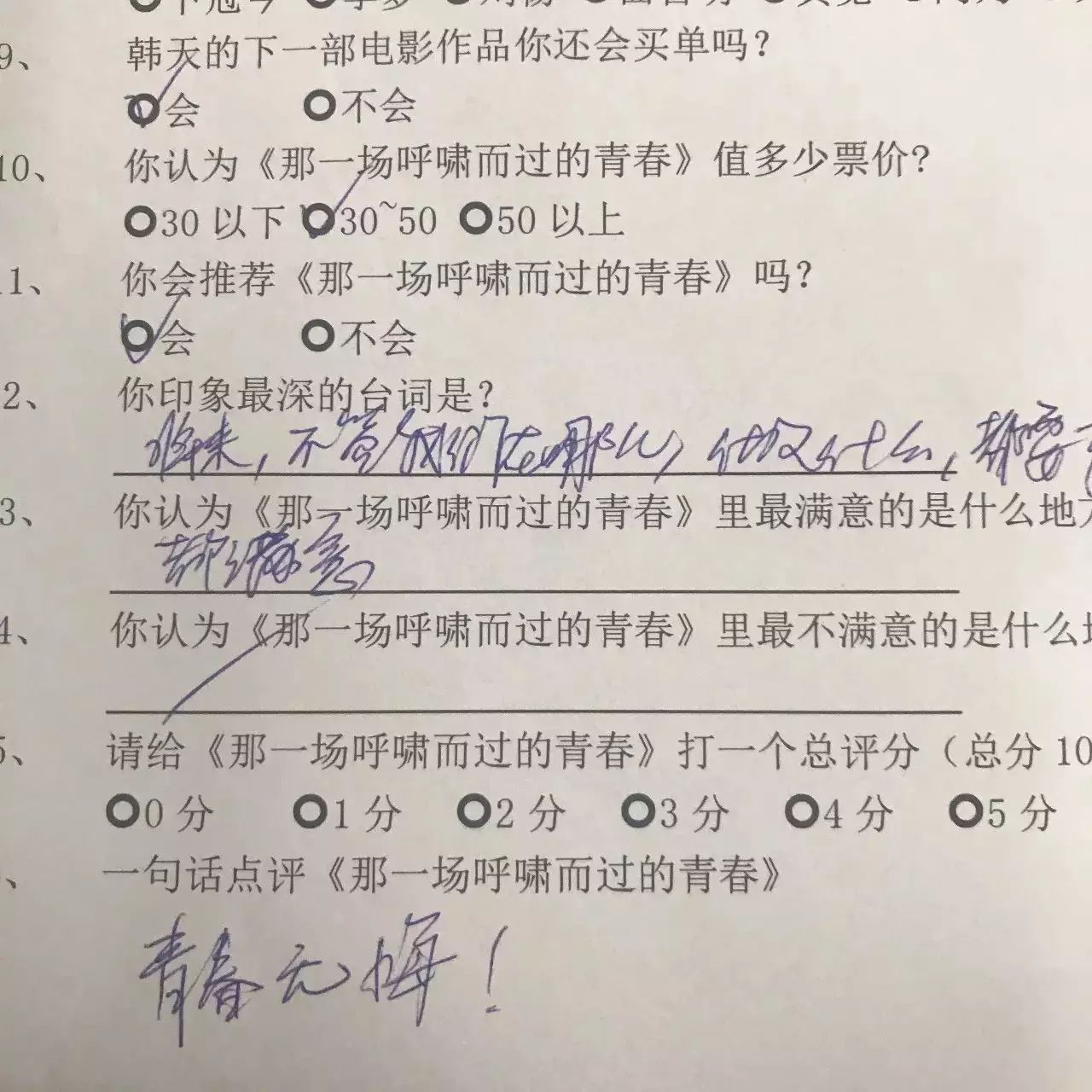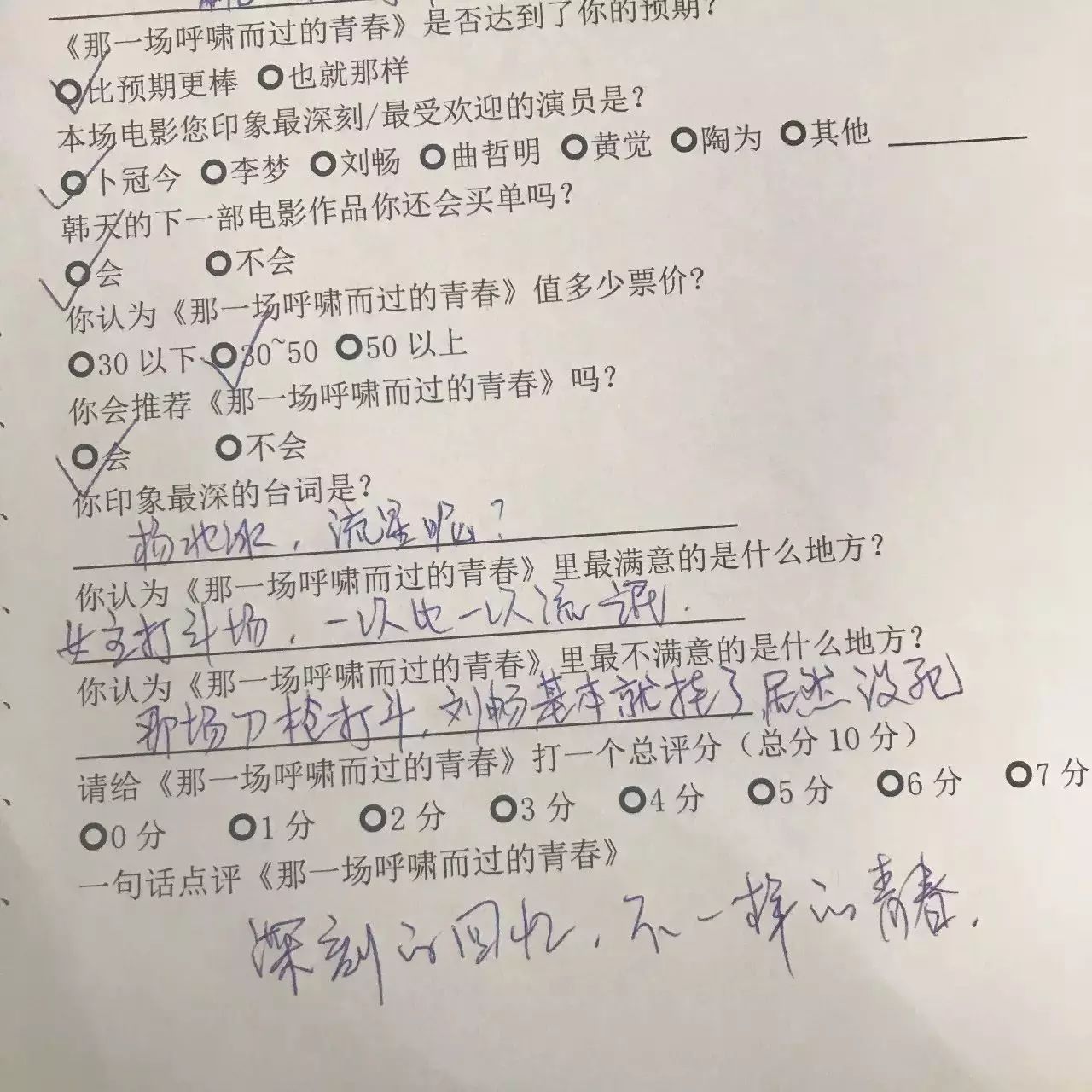 “和《致青春》《匆匆那年》比,《呼啸》是8.5分;和《萨玛莉亚的女孩》、《十三棵泡桐》比,那么是7.5分。我个人很喜欢,也会给朋友推荐。我能深刻体会到导演想要传达给我们的一些深刻的东西。青春过去就是过去了,无论过程的好坏,我们都应该要move on 。”