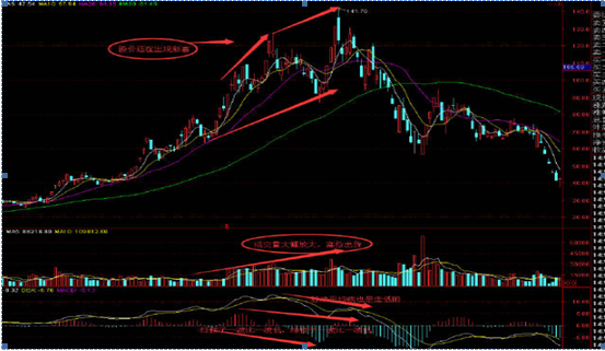 当K线图上的股票价格走势一波比一波高,股价一直在向上涨,而MACD指标图形上的由红柱构成的图形的走势是一波比一波低,即当股价的高点比前一次的高点高、而MACD指标的高点比指标的前一次高点低,这叫顶背离现象。顶背离表示该股价的上涨是外强中干,暗示股价很快就会反转下跌,是比较强烈的卖出信号。配合成交量等指标,可以用来辅助判断个股和指数的顶部。举例如下: