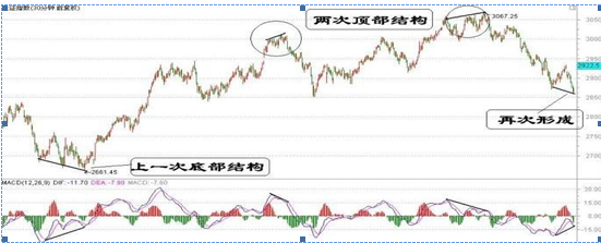 结构是根据价格和MACD的背离来进行判定的。价格和指标产生了背离,首先经过指标钝化,然后指标转向而形成结构的过程。