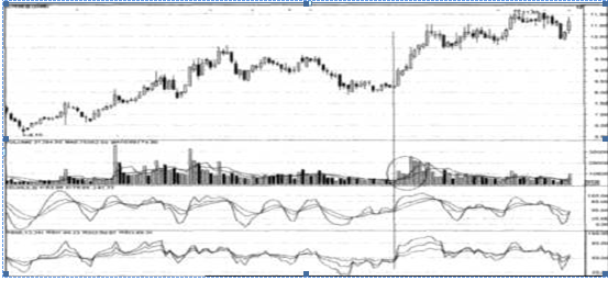 (4)价量失衡。股价在上升过程中,如果成交量突然空前放大,而股价却突然停滞不前或缓慢上涨(如图3-17所示),说明庄家可能在出货,顶部很可能出现。如果出现以下量价失衡情况,则可断定顶部已经形成:成交量在反弹中不但不放大,反而缩小;股价涨势不旺,涨时无量,跌时放量;股价反弹的幅度还不及跌幅的一半等。