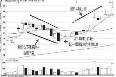 一部分主力在洗盘时,会采用小幅盘跌的方式,在大盘创出新高的过程中,主力操控的个股却在不断收阴,构筑出一条平缓的下降通道,股价在这个通道内逐步下落,某一个交易日又突然收出一根阳线,股价下跌的趋势被扭转,并开始慢慢站住脚跟,这样的现象说明洗盘已经接近尾声。