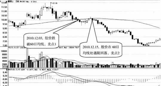 股价跌破60日均线后,如果出现回升并在60日均线处重新遇阻回落,说明此次跌破的有效性得到了确认,构成卖点2。