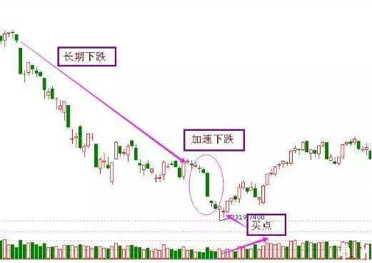 大盘或是个股在经历长时间的下跌之后,会突发的出现下跌加速,而后成交量则连续的增长,这时候就是大胆买进的时机。