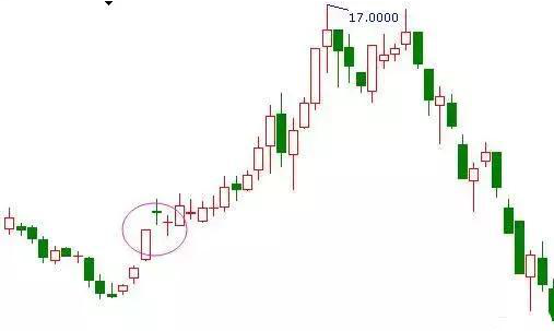 当个股在经历长期下调之后,在回升的之后放量出现一根大阳线,之后连续出现三个不断向上的小阳线或是十字星,这表示后市的上涨可能很大,可以立即买进。