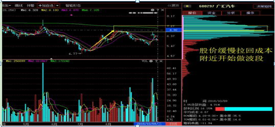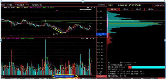 https://p1-tt.byteimg.com/origin/pgc-image/RN47yyi3IpFdZV?from=pc拿广汇汽车举例,这是一个70亿盘子的中大盘股,今年5月份的时候我们可以看到,筹码基本全部集中在7.3附近,股价在这个位置也是震荡了半年之久,5月23号的利好冲高回落之后,股价一路开始阴跌,到7月份的时候最低已经到了4.77,跌幅高达32%,在这一路阴跌下来我们可以看到上方7.3的筹码峰纹丝不动,超过30%的亏损大量筹码还保持不动的只有主力和机构,再加上这票又是二线蓝筹,亏损严重的情况下主力不会选择轻易离场,那么这个时候就会选择开始自救。