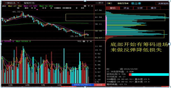 案例二:信立泰002294,股价从6月份一路阴跌下来到26附近,跌幅达到37%,但是上方的筹码并没有怎么动摇,最近低位的筹码开始变多,说明低位开始有资金抄底,上方被套的主力接下来会想办法进行自救,过一段时间咱们等它自救开始再来跟大家好好分析。