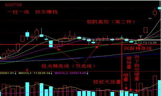 即出现假阴真阳的当日,其量柱大于前一日的量(放量越大越好),假阴真阳之后阶梯式缩量或缩倍量为佳。
