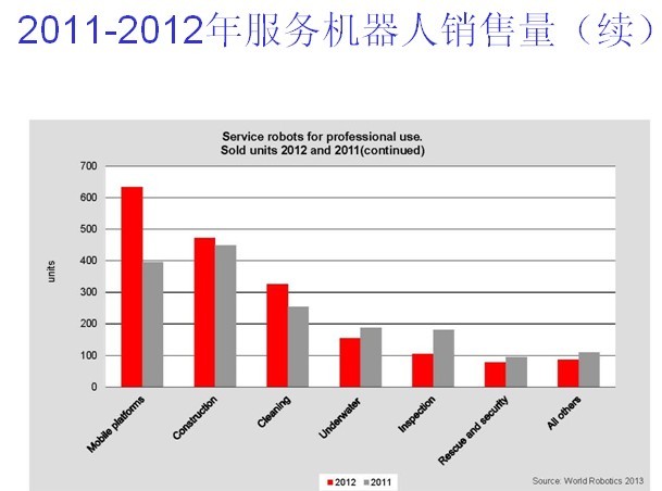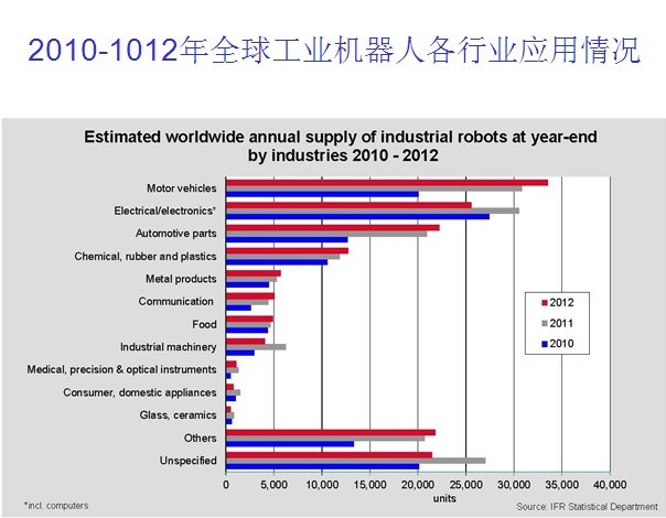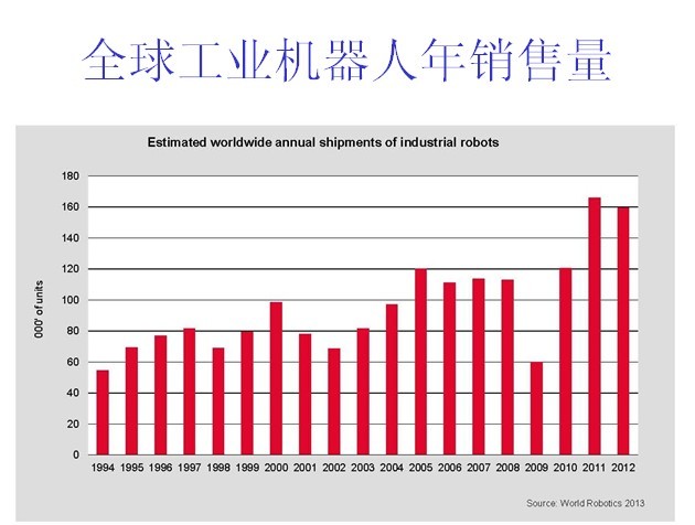 我们下来了解一下全球工业机器人产业现状。从1994年到2012年的全球机器人年销量情况是,除去2009年因金融危机导致的销量明显下滑,整体的趋势是逐年递增。近三年来,工业机器人在汽车、电气电子、汽车零部件行业是应用最广的。全球范围来说,美国、德国、韩国、日本、中国是机器人运用比较多的国家,另外,巴西、印度、泰国、台湾地区也是使用比较多的国家。在未来几年,亚洲将是机器人广泛推广的地区,这里面会有很大的机会。这是工业机器人部分,在服务机器人方面,比如扫地机器人,现在销售额有15亿,但是仍然还有许多家庭还没用呢,说明这个领域还有很大的空间。但现在扫地机器人还不够智能,有待技术的进一步升级。我相信,在机器人性能不断提高后,一定会有更多的家庭加入使用机器人做家务的行列。