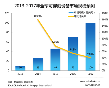 下图是我们对近五年全球可穿戴设备是长规模的预测,预计2017年全球市场规模可到100亿美元。