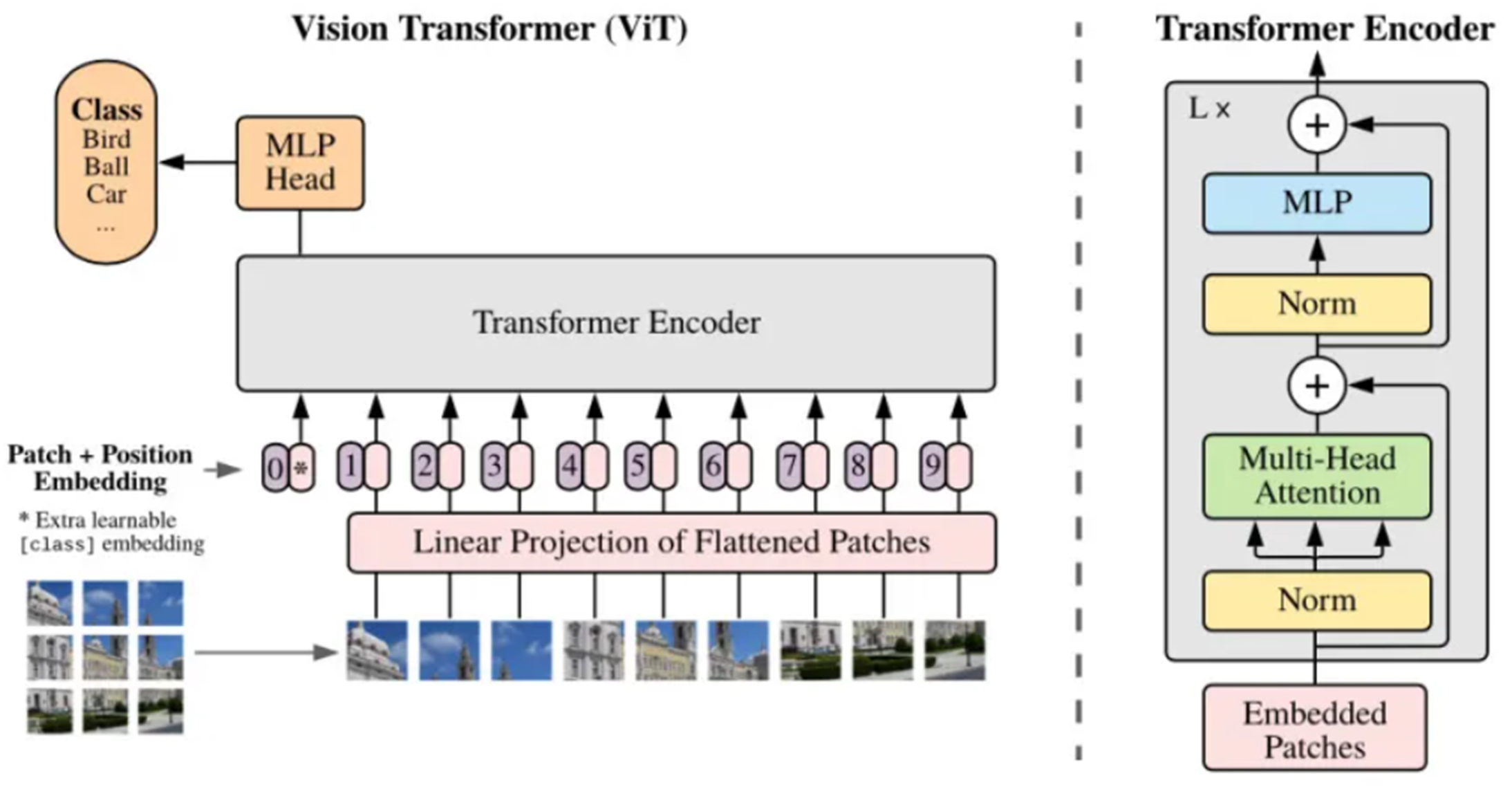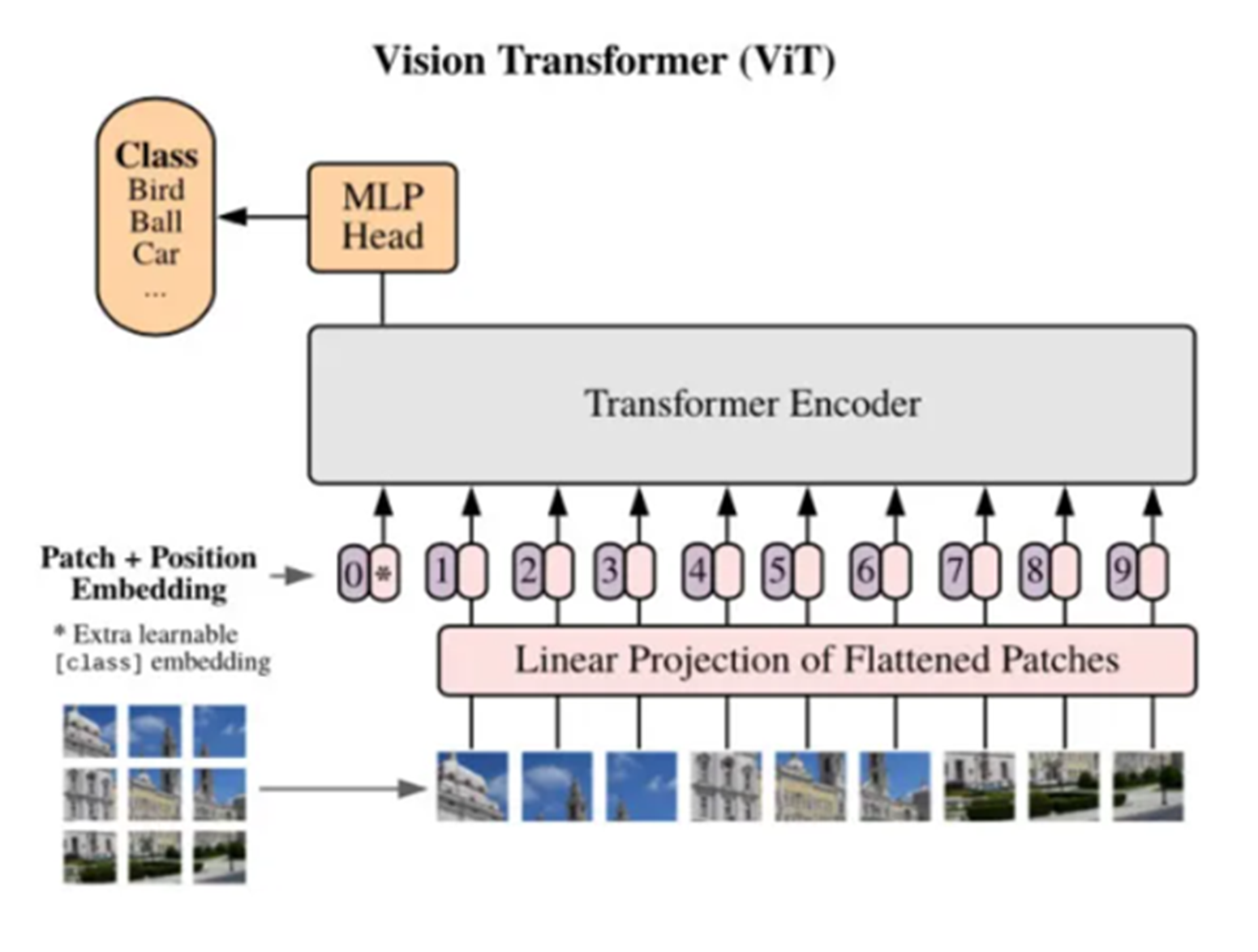 nViT将CV和NLP领域知识结合起来,对原始图片进行分块,展平成序列,输入进原始Transformer模型的编码器Encoder部分,最后接入一个全连接层对图片进行分类。