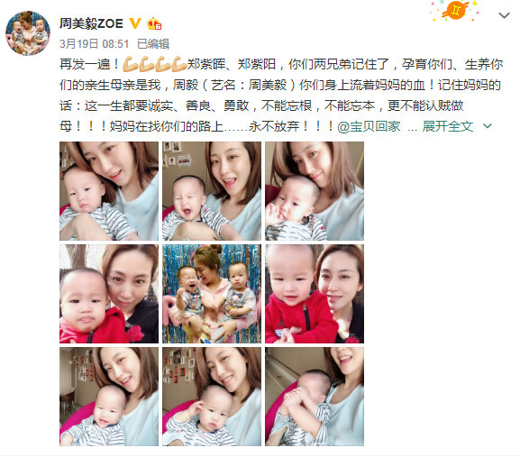 周美毅的微博全文是这样:郑紫晖、郑紫阳,你们两兄弟记住了,孕育你们、生养你们的亲生母亲是我,周毅(艺名:周美毅)你们身上流着妈妈的血!记住妈妈的话:这一生都要诚实、善良、勇敢,不能忘根,不能忘本,更不能认贼做母!!!妈妈在找你们的路上……永不放弃!!!