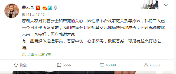 #曹云金唐菀离婚# @曹云金 发微博证实已与@唐菀Zoey离婚,“感谢大家对我曹云金和唐菀的关心,因性格不合及家庭关系等原因,我们二人已于今日和平协议离婚,我们依然会共同抚育女儿健康快乐地成长,同时祝福彼此未来一切安好,再次感谢大家!