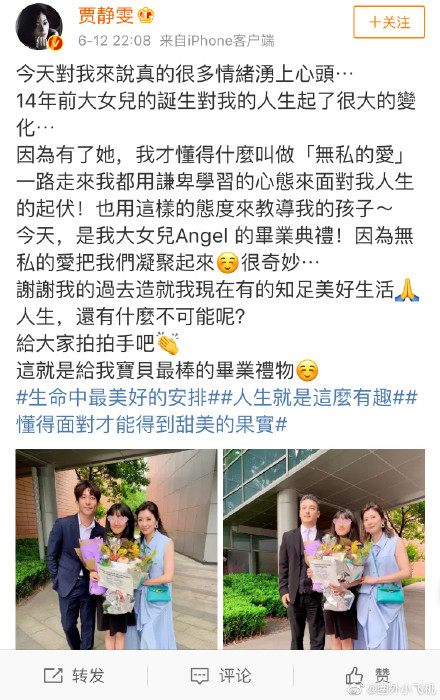 #贾静雯与前夫同框# 12日晚,@贾静雯 在微博晒出参加大女儿梧桐妹毕业典礼的照片,感慨写道:“因为无私的爱把我们凝聚起来,很奇妙......这就是给我宝贝最棒的毕业礼物。”照片中梧桐妹一双大长腿个头已快赶上妈妈,贾静雯前夫、梧桐妹爸爸孙志浩也现身毕业典礼,三人罕见同框。贾静雯出席女儿毕业典礼 。