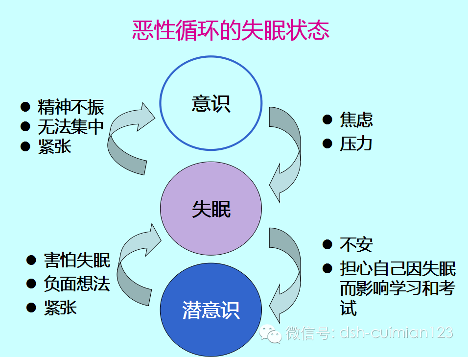 小宇父母是普通工人,家境一般,独生子,小宇一向孝顺懂事,学习成绩优异,家人对小宇期待非常高。专门在学校附近租了房子,外婆特地从外省来到广东照顾小宇的生活起居。小宇的父母与同事或同学在一起时就爱比较自家孩子的学习成绩。小宇为了父母的面子,不敢有半点的松懈,压力越来越大。高三第一次模拟考试的第一天中午,小宇突然失眠了,一中午睡不着,下午考试时头晕沉沉的,题都做不完。心情大受影响,开始担心晚上睡不着,结果是越担心越失眠,接下来后面的考试全部发挥失常。成绩出来了,小宇从全级前30名掉至200几名。这样的结果让小宇无法接受,小宇把所有的责任全归于失眠,对失眠更加关注了。每天晚上第三节晚修课就开始担心失眠,越担心越失眠,越失眠越担心,陷入了失眠——恐惧失眠——更加失眠——更加恐惧失眠的恶性循环当中,并逐渐出现偏头痛、心悸、胃肠炎等躯体症状。小宇因此情绪波动大,焦躁不安,易发脾气,在家时乱摔东西。